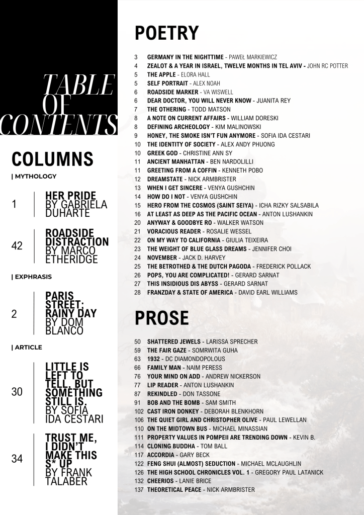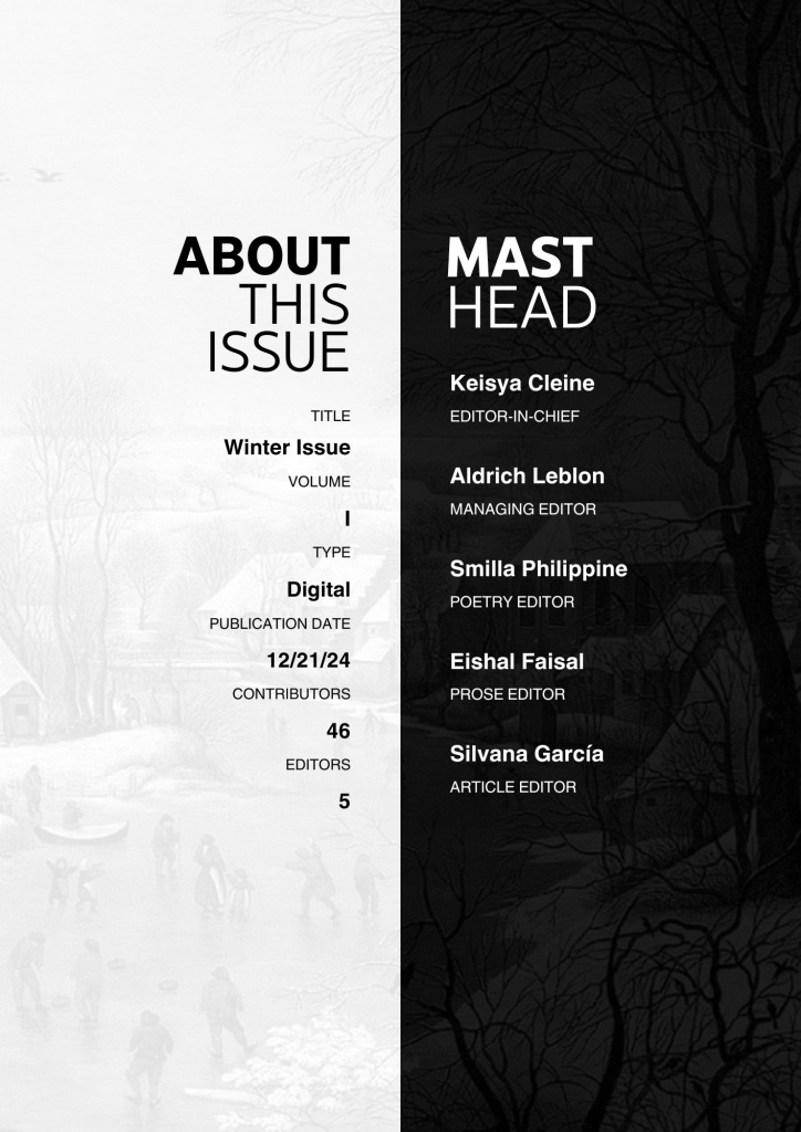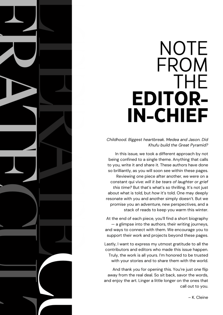 In this issue, we took a different approach by not being confined to a single theme. Anything that calls to you, write it and share it. These authors have done so brilliantly, as you will soon see within these pages. Reviewing one piece after another, we were on a constant qui vive: will it be tears of laughter or grief this time? But that’s what’s so thrilling. It’s not just about what is told, but how it’s told. One may deeply resonate with you and another simply doesn’t. But we promise you an adventure, new perspectives, and a stack of reads to keep you warm this winter.
