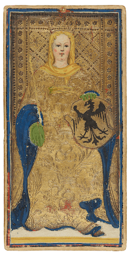 Medieval and Renaissance religious art were a clear influence in the creation of the Visconti-Sforza cards. This influence is evident in both the artistic style and the use of color, which reflects the Byzantine elements commonly found in European church art, including the round elongated faces and the prominent use of gold.
