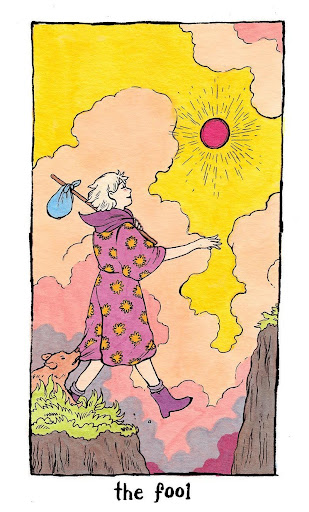 Other artists, such as Tillie Walden, reinterpret this archetype by telling a different story. In the Cosmic Slumber Tarot, Walden introduces the deck with a young person on the verge of falling off a cliff, while their companion—a brown dog—tries desperately to stop them. This protagonist is so captivated by the passionately red sun above that they are oblivious to the danger below. Unlike the RWS version, this depiction of The Fool is more likely to encounter tragedy, as it seems to lack any solid ground beneath them.